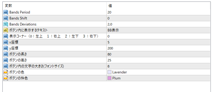 上から3行は、MT4オリジナルのBandsと全く同じ項目です。